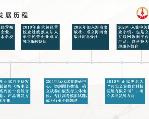 發展曆程 2007年(nián):承包經營衡水名校(xiào)校(xiào)辦企業,銷售衡水名校(xiào)月考卷,協辦全國(guó)高中教師(shī)發展研討(tǎo)會,以品質進入全國(guó)市場 2008年(nián):正式自(zì)主研發和出版銷售《衡水金卷》系列的十套綜合模拟卷,産品研發方向更加明晰 2010年(nián):由承包經營校(xiào)企過渡到獨立法人(rén)單位私營企業,進一步完善企業管理(lǐ)體(tǐ)系,成立獨立編校(xiào)隊伍,确定負責任的教